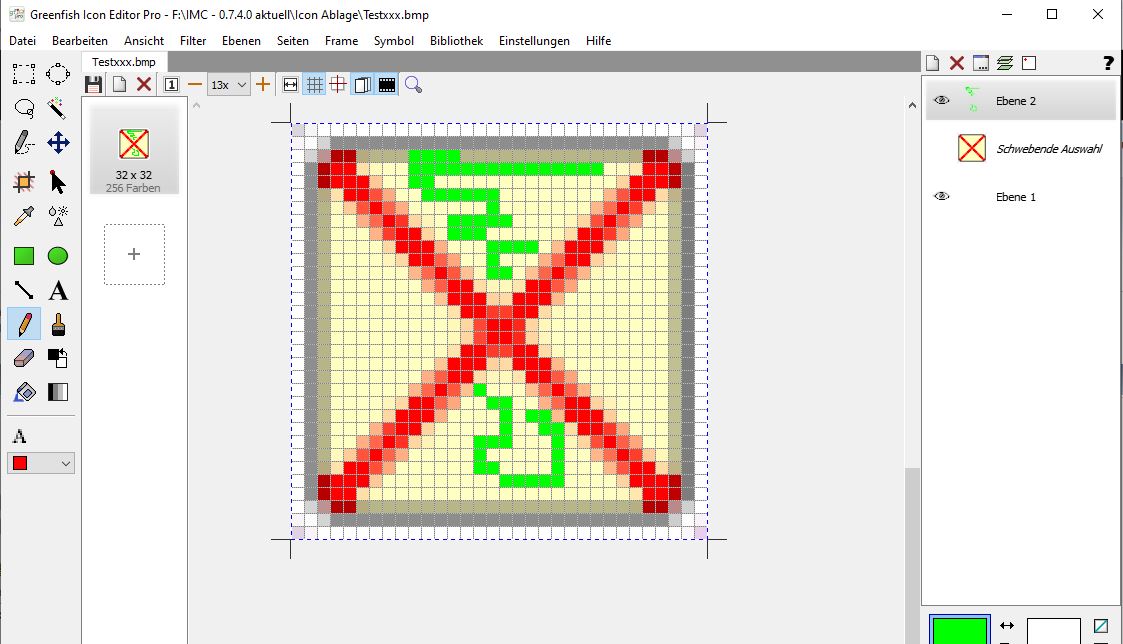 I copied an icon from the database using the Snipping Tool in Windows and imported it into Greenfish. This creates a new layer. The layers are stacked on top of each other, and their transparency is adjusted so that both are visible. Then, the additions/changes are made in the new layer. Finally, the transparency is removed, the icon is exported, and inserted into the IMC.