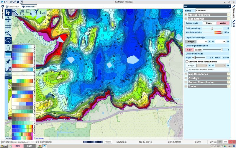 Auf dem ersten Bild kann man links die Palette sehen. Es ist eine der beiden 'dichten' Paletten, welche für 75 Meter in Meterschritten ausgelegt sind. Da der Chiemsee aber nur 73 Meter hat, habe ich die Tiefe fix auf 75 Meter eingestellt. Zudem würden sich die Farben auch nicht ändern, wenn ich nur einen kleinen Uferbereich von z.B. 0 - 15 m Tiefe generieren würde.