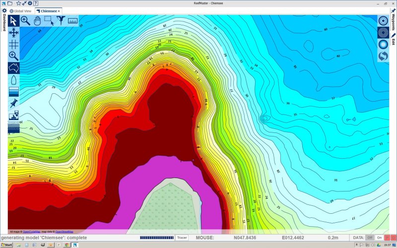 Die ganz flachen Bereiche sind hierbei je Meter mit einer anderen Farbe, je tiefer es wird, desto mehr Meter sind mit einer Farbe zusammengefasst. Dies ist im zweiten Screenshot deutlicher zu erkennen.