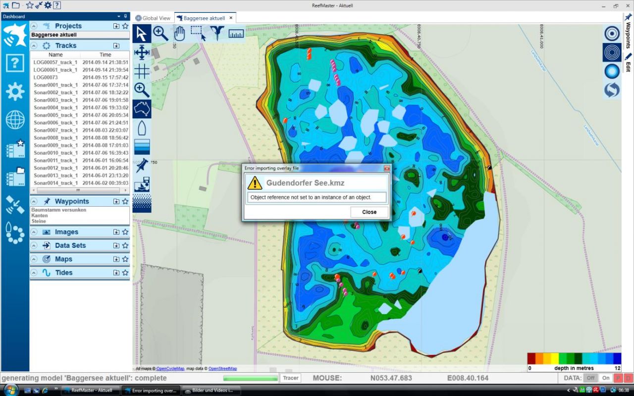 - RM öffnen, Workspace öffnen, entweder Usermap oder Project öffnen, mit rechter Maustaste in der Usermap klicken, im geöffneten Menü wird im obersten Punkt die Möglichkeit gegeben, ein Image zu generieren, "all components" angeklickt und meine kml bzw. kmz-Datei, die ich vorher in Google Earth gespeichert hatte, angeklickt und quasi importiert. Danach zeigt sich dann die Fehlermeldung.