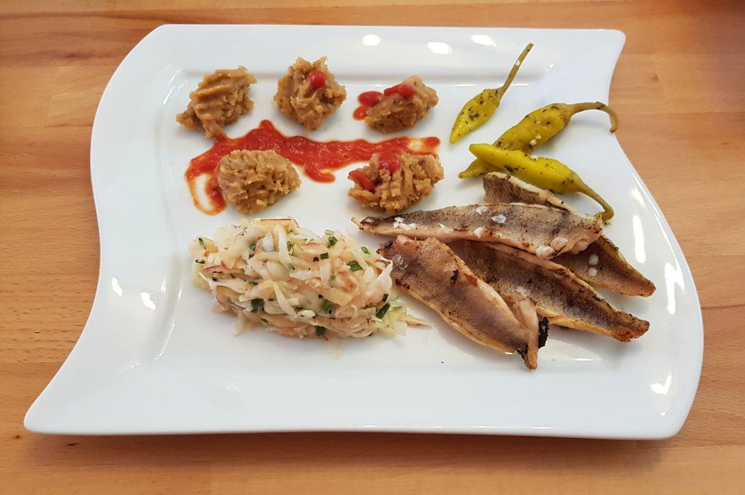 Gegrillte Barschfilets mit Walnusspaste und Kohlrabi-Apfel Salat.