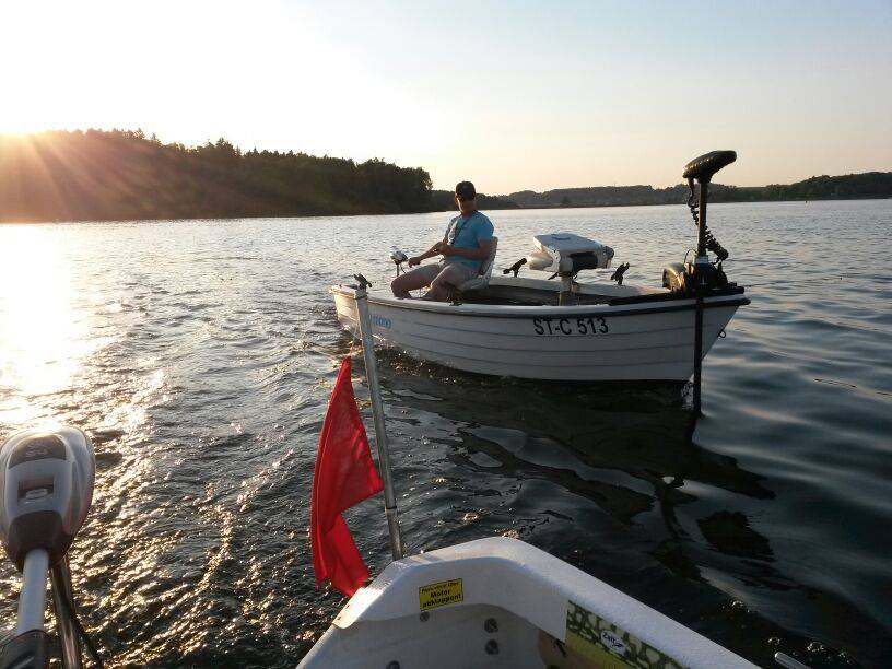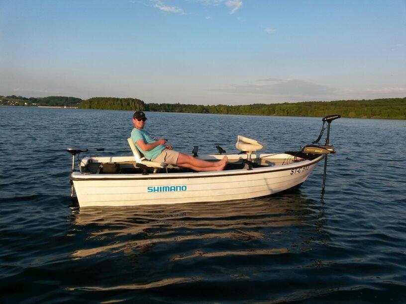 Da ich keinen Führerschein besitze, mein Boot recht klein ist, ich ihn jederzeit auch allein abnehmen kann bzw muss, und ich angeln und nicht rasen will habe ich mich für einen alten aber sehr zuverlässigen Johnson 8PS 2-Takt Stinkeverbrenner entschieden, der das Boot auf ca 10 bis 12 KmH Bringt  :grossefreude1: