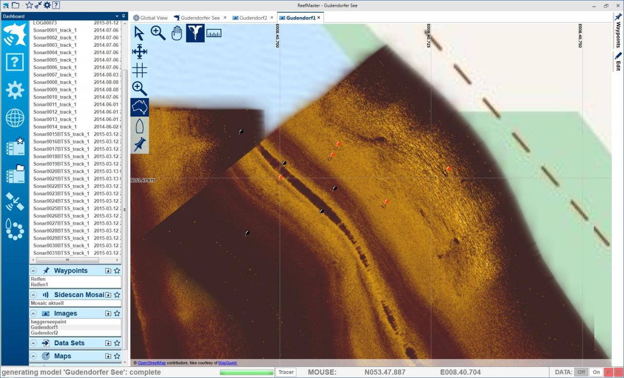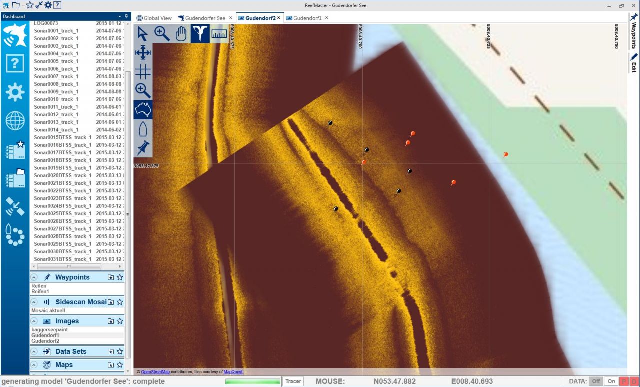 Was aber sehr auffällig war, dass sehr prägnante Punkte verschoben dargestellt wurden, ob nun im ersten oder zweiten Durchgang weiß ich natürlich nicht. Ich hatte auf beiden Bildern in der Sidescan-Ansicht mehrere versenkte Autoreifen mit Wegpunkten besetzt und die Lage später vergleichen. Diese scheinen in beiden Ansichten bei gleicher Lage untereinander auf relativ kleiner Fläche (wenige Meter) bildlich verschoben zu sein.