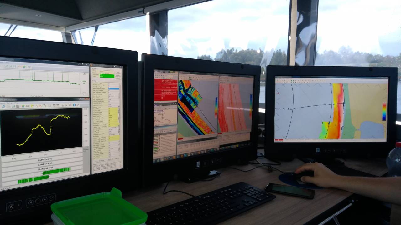 auf mein arbeit bin ich aspirant skipper und einer unsere kunden ist der 'Vlaamse Hydrografie', die leute haben richtig krasse Kongsberg Multi und single beams..