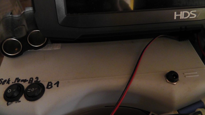 Ich habe einen Wechselschalter verbaut. Betreibe die zwei Akkus nacheinander. Der gelbe Schalter schaltet das Display ein bzw aus. Mit dem Strom Spannungs Messer kontrolliere ich vor dem Angeln die Akkus und auch beim laden wie voll sie sind.