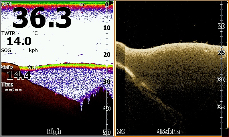 Rechts im Downscan sieht man das da wohl irgend etwas ist das nach unten abfällt.