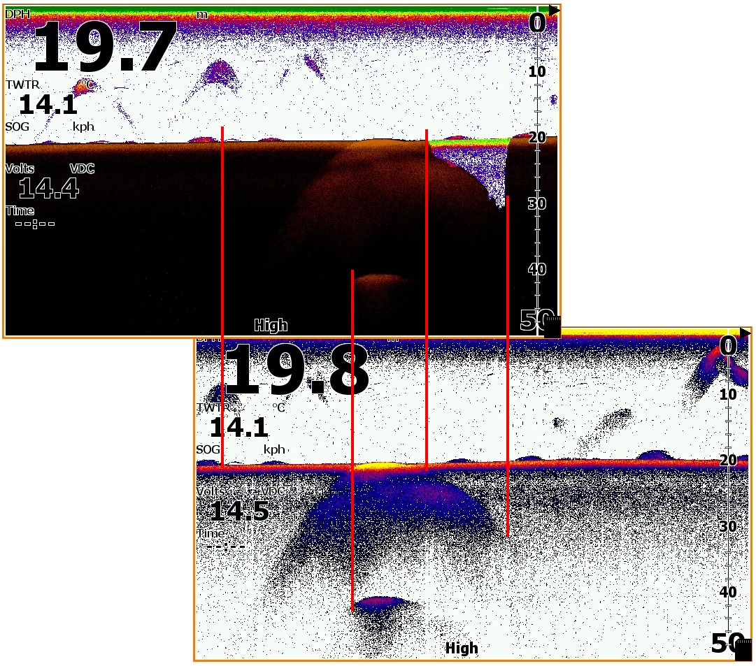 Wenn man sich das ganze im Vergleich Downscan und Weiß mit Grund Erkennung anschaut, stellst es sich wie folgt dar.