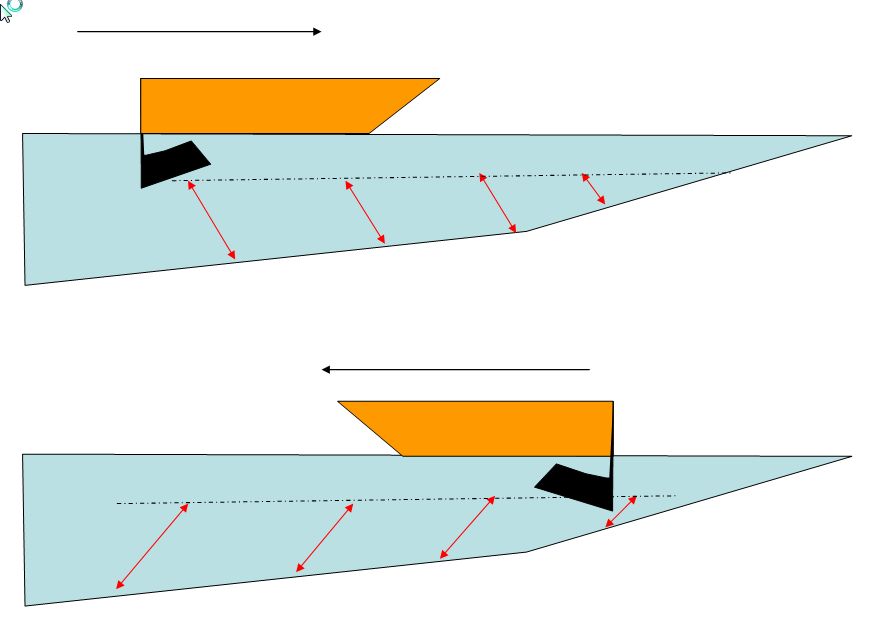 Es gäbe aber auch noch eine andere, schlüssige Erklärung. Wenn der Geber nicht ganz gerade ausgerichtet ist, sondern etwas verkantet im Winkel vom Boot abstrahlt, dann würde man exakt so ein Bild erreichen, wie zu sehen ist. Fährt man in Richtung Ufer, denn erscheint der flache Uferbereich zu früh und wenn man dann wieder vom Ufer weg fährt, wird der tiefe Bereich viel zu früh angezeigt. Manchmal bekommt man gar nicht mit, wenn der Schwinger sich etwas verdreht. Ich habe mal ein Bild beigefügt, das den Sachverhalt schematisch verdeutlichen soll.