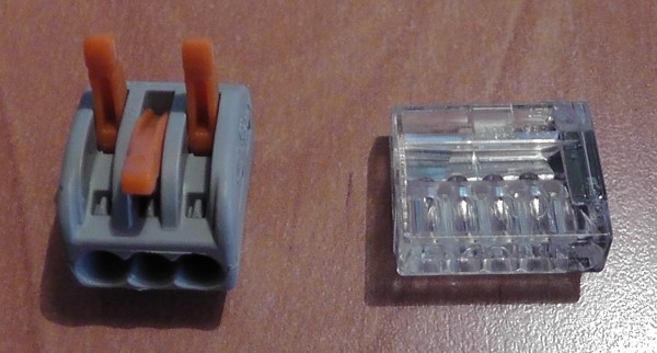 Auf dem ersten Bild sind die verschiedenen Klemmen für zwei, drei und fünf Leiter zu sehen, wobei die Klemmhebel teilweise geöffnet sind. Die grauen Klemmen sind aus der älteren Serie 222, die durchsichtige Klemme ist aus der neuen Serie 221. Letztere ist zur besseren Überwachung der richtigen Platzierung der Drähte durchsichtig, ist besser zu bedienen und von deutlich kleinerer Bauart. Beide Serien gibt es für zwei, drei oder fünf Drähte. In einer Öffnung lassen sich aber bei dünnen Litzen u.U. auch mehrere Kabel zusammen verbinden.