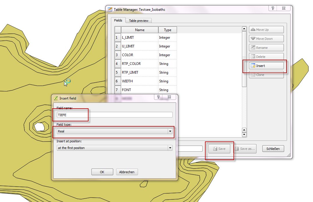 Irgendwie scheine ich mir eine andere Version von QGIS runtergeladen zu haben (QGIS 2.10 Pisa). Insoweit finde ich die von dir auch graphisch dargestellten Schaltflächen nicht alle, habe mich aber halbwegs durchgewurschelt und eine neue Spalte mit "Tiefe" als TYP "Real" belegt, allerdings wird diese dann später als "double" angezeigt. Nach dem Speichern in QGIS gibt es aber keine Shapes-.dbf-Datenbank, welche ich in Excel mit einer Spalte "VALUE" vorfinden könnte. Alle .dbf`s haben keine solche Spalte.