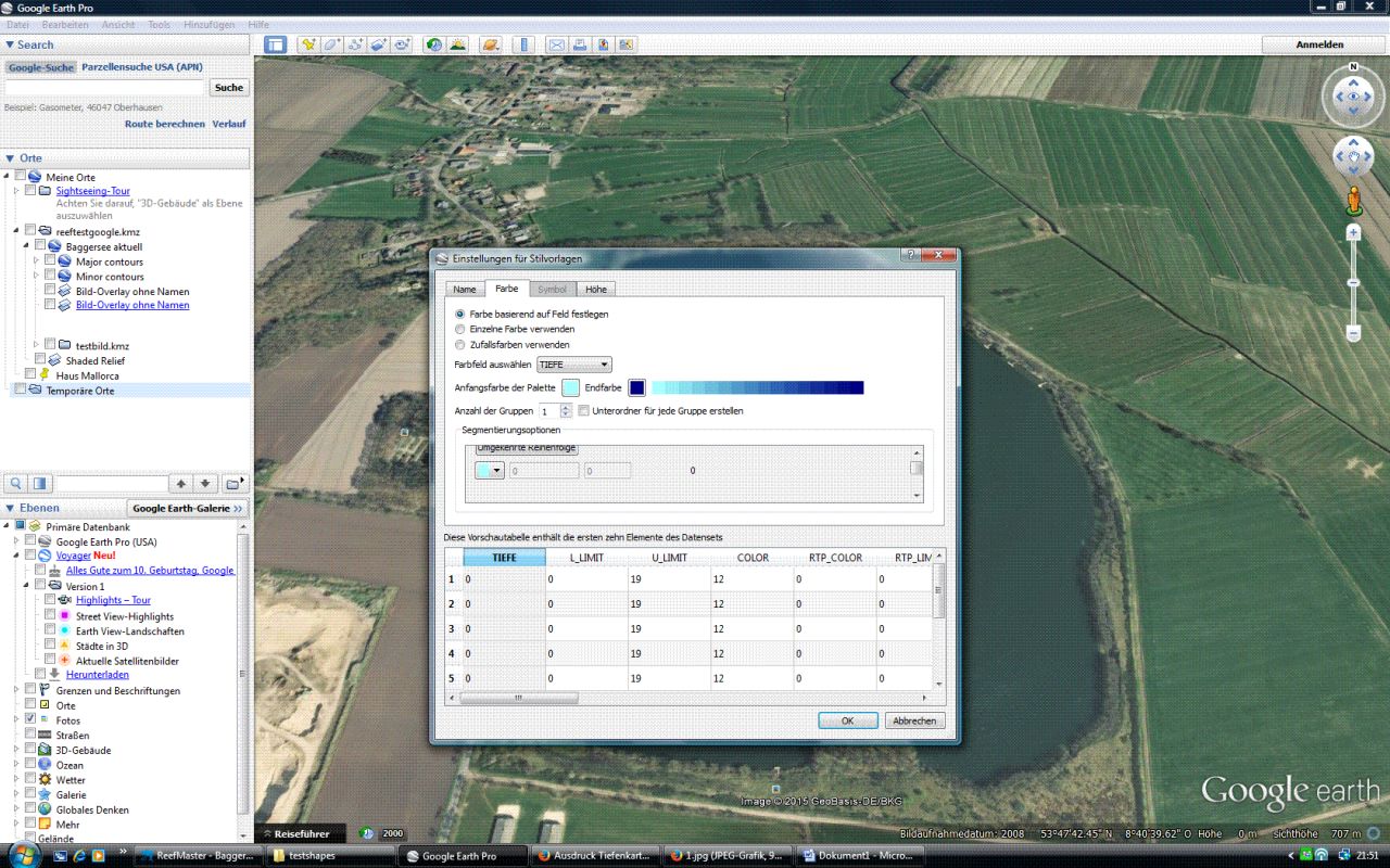 Die Spalten sind eingefügt, die Tiefen als Dezimalzahl vorhanden und fast alles andere klappt auch. In GE wird leider anstatt verschiedener Tiefenlinien nur der gesamte See als ein weißer Fleck dargestellt. In den Farbeinstellungen der Stilvorlage ist eigenartigerweise nur eine Tiefe angezeigt.