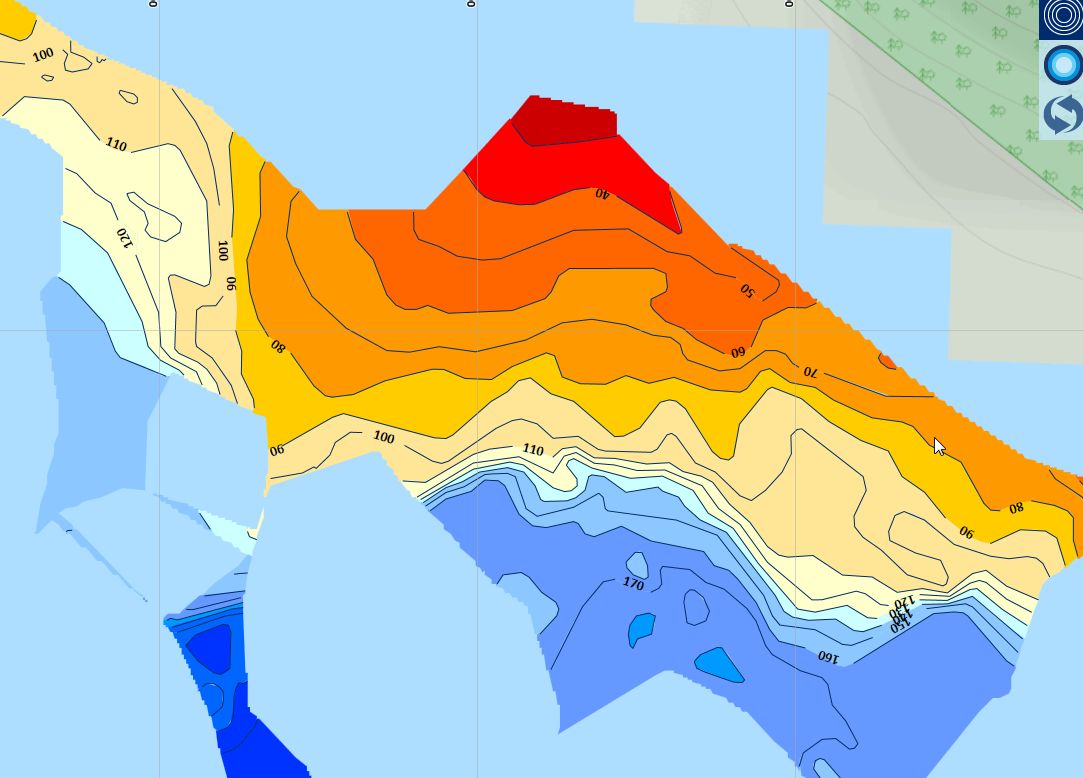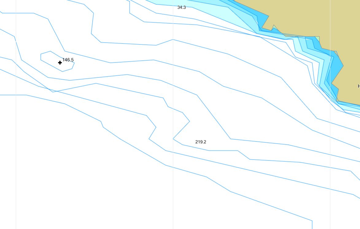 Der 83/200er reichte. Wir waren nämlich nicht über 170 m hinaus (Naturköder) und auf der anderen Seiten im viel flacheren Uferbereich mit Gummi unterwegs. Die Auswertung von Mitschnitten in RM ist auch sehr hilfreich für nächstes Jahr, denn es offenbart sich die wirkliche Tiefenstruktur. Übliche Kaufkarten gehen bis 50 m in 10 m Schritten und dann in 50 m Schritten, mit Ausnahme von Garmin und Navionics mit 2 m-Schritten, was aber wiederum manchmal zu unübersichtlich wird und eher auch nur interpoliert statt gemessen zu sein scheint. Ich lege mal einen Vergleich bei, der in etwa die selben Positionen abbildet.