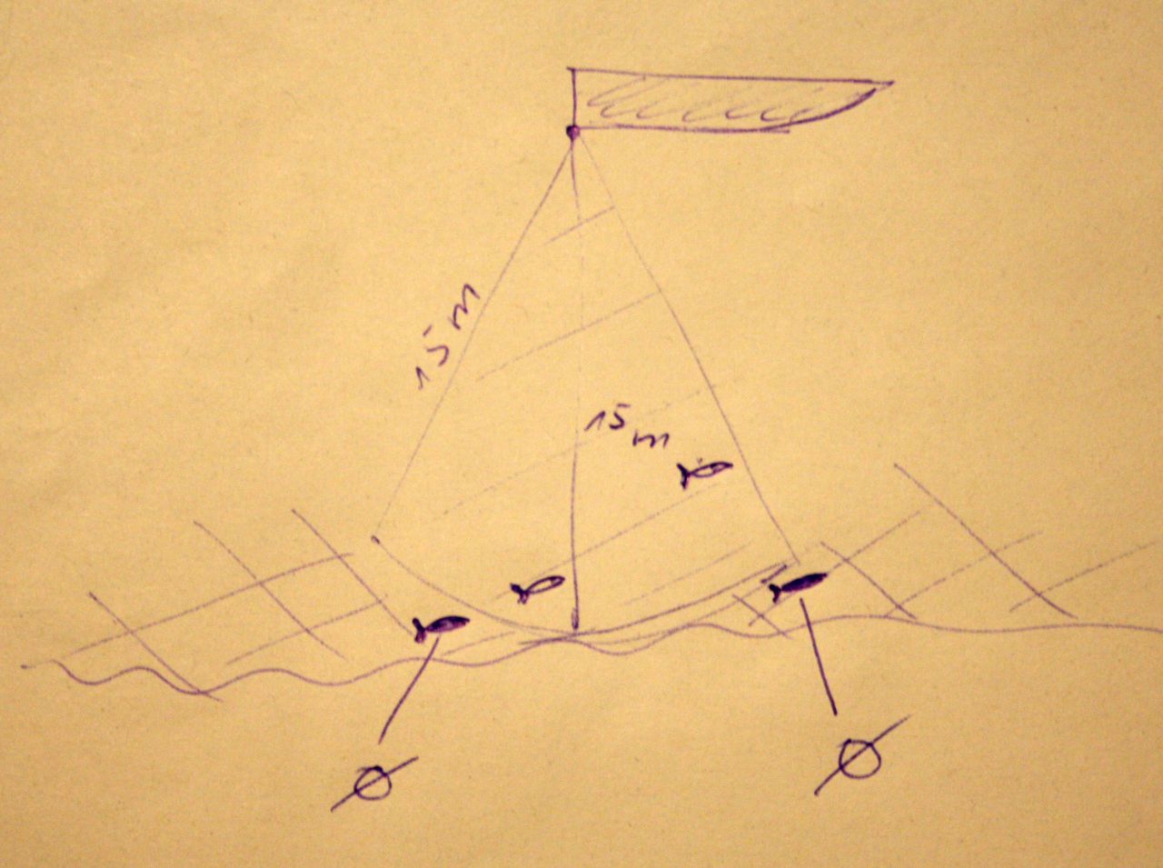 Die Zeichnung im Anhang verdeutlich dies hoffentlich etwas. Wenn die Tiefe unter dem Geber z.B. 15 m ist, dann ist alles außerhalb des Radius von 15 m vom Geber aus nicht mehr sichtbar für das Echolot. Die beiden ausgefüllten Fische auf der Zeichnung sind für das Echolot 'unsichtbar', weil die Distanz zum Geber größer als eben die Tiefe ist.