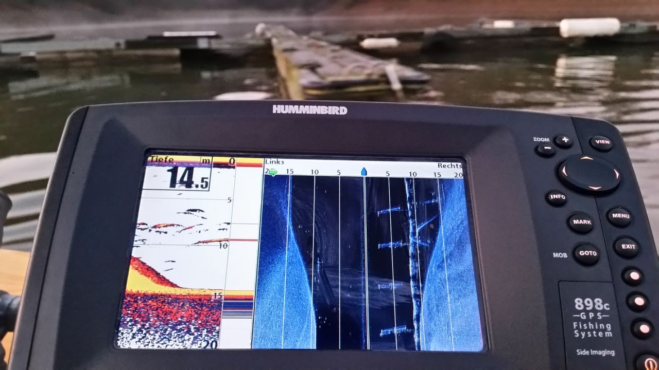 Den Geber habe ich an der Geberstange hinten rechts am Boot, ca. 30cm unter Wasseroberfläche. Das Echolot ist auch auf der rechten Seite 50cm vor der Geberstange. Auf dem Bild ist der Bug nicht zu sehen. Der ist ganz links vom Echolot. In die Richtung fahre ich auch. Die Längsebene am Echolot, ist die Plattform, die hinterm Echolot von rechts nach links verläuft. Das ist nicht auf 8 - 9 m tiefe, sondern das ist in ca. 8 -9m Entfernung Rechts vom Boot. Die Plattformen gehen nur bis zu 70cm tief ins Wasser.
