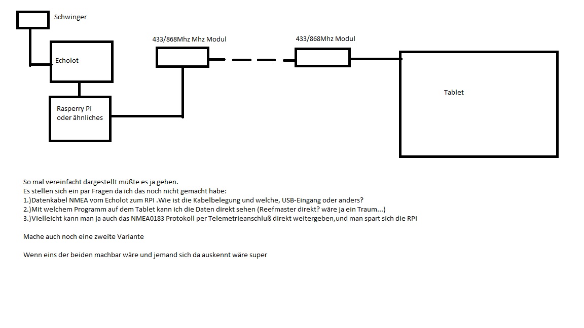 Schwinger an APM (ÄHHM kann ich das in den Telemetrieanschluß einschleifen?) weil ein 3DR Set ist im Boot verbaut .wie geht es dann weiter? Kann ich die ankommenden Daten dann mit RM auf dem Laptop nutzen? oder muß ich dann nochmal in das Echolot rein zum aufzeichnen?   Sry mein Brain läuft grad heiß haha