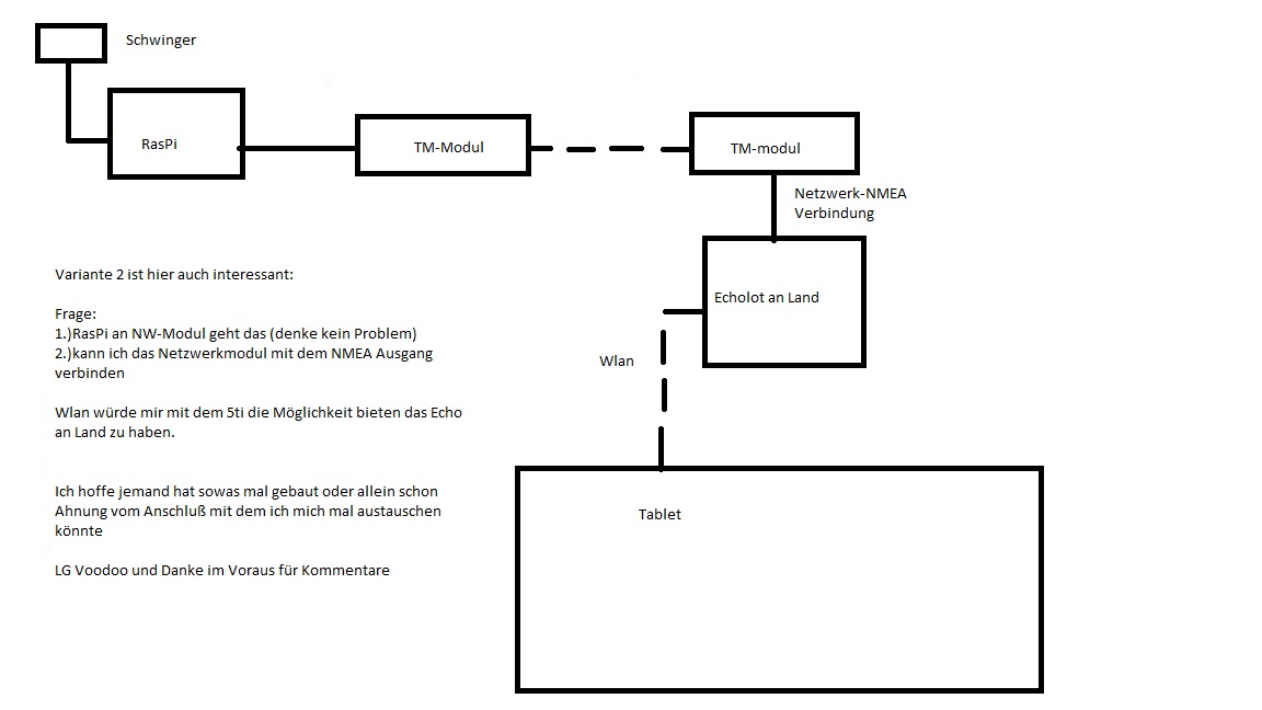 Der Schwinger sendet NMEA 0183 Datensätze die so weiter geleitet werden müssen. Zusätzlich wird ja auch die Posiition, sinnigerweise auch als NMEA 0183 Datensatz, noch gebraucht. Am Ende müssen die Nutzdaten (Echolot und Position) ggf. aus dem Datenstrom separiert und als Nutzdaten an RM oder wem auch immer geleitet werden.