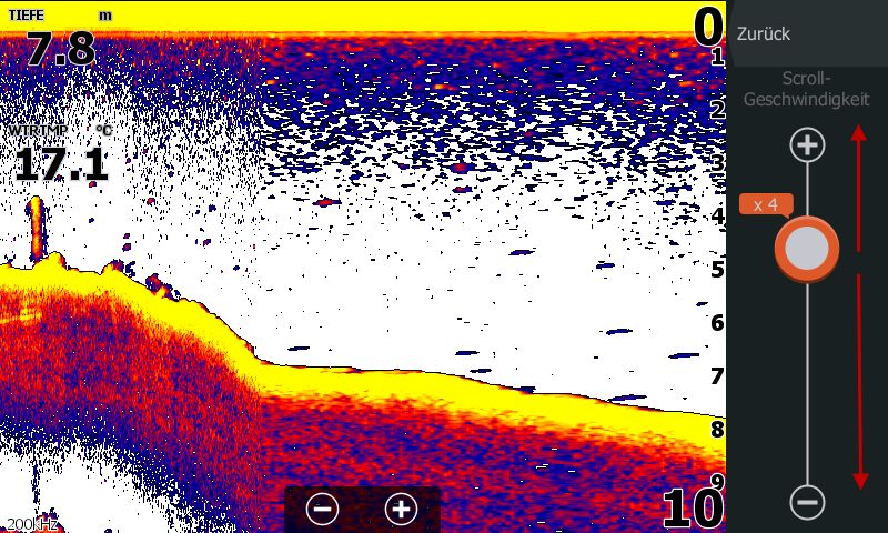 Schau mal das Bild an. Hier wird beim HDS mit einfachem Fingertipp die Bildlaufgeschwindigkeit (Scrollgeschwindigkeit) verändert. Das geht beim echoMAP zwar auch automatisch über einen GPS-Abgleich, hat aber bei der von Dir angegebenen Geschwindigkeit kaum eine Relevanz. Gegen ein echoMAP spricht das Tastenmenü. Wer einmal Touchscreen hatte, weiß das extrem zu schätzen. Für das echoMAP spricht die etwas bessere Sidescanquali im Flachwasser - war aber auch nicht so Dein Thema.