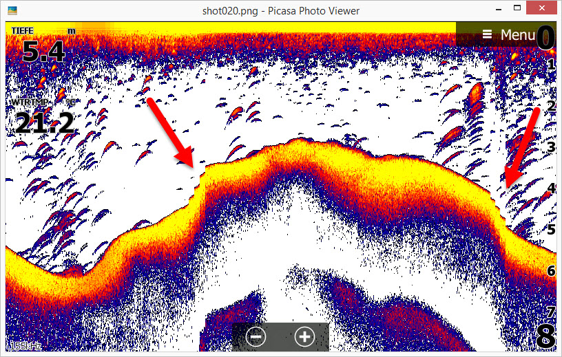 stelle ich an meinem HDS die benutzerdefinierte Frequenz von 155 khz ein, verliert der Geber ab und an kurz den Bodenkontakt. Das Bild friert dann für 1-3 Sek ein, in dieser Zeit scheint der Geber auch nicht zu senden/empfangen. Optisch stellt sich das dann in einem Treppeneffekt dar (s. Bild, rote Pfeile). Dieser Effekt ist unabhängig vom SOG, tritt bspw. auch auf wenn das Boot steht.