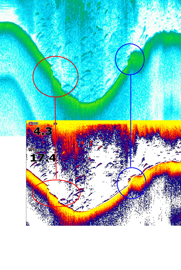 Anbei mal der Vergleich zwischen dem Screenshot des HDS (unten) und der 'View Sonar' Funktion in Reefmaster (oben). Der Treppeneffekt wird bei beiden dargestellt...schaut man sich die einzelnen Punkte des Tracks an, so fällt auf, dass an den beiden Stellen die den Treppeneffekt aufweisen, die Punkte des Tracks etwas weiter auseinander liegen. Ich habe versucht das in dem angehängten Screenshot einmal zu verdeutlichen (rote Pfeile), ist aber tatsächlich schwer zu erkennen. Misst man in Reefmaster nach, so liegen die Punkte ca. 0,4 m weiter auseinander als die restlichen Punkte  :weisnicht1: