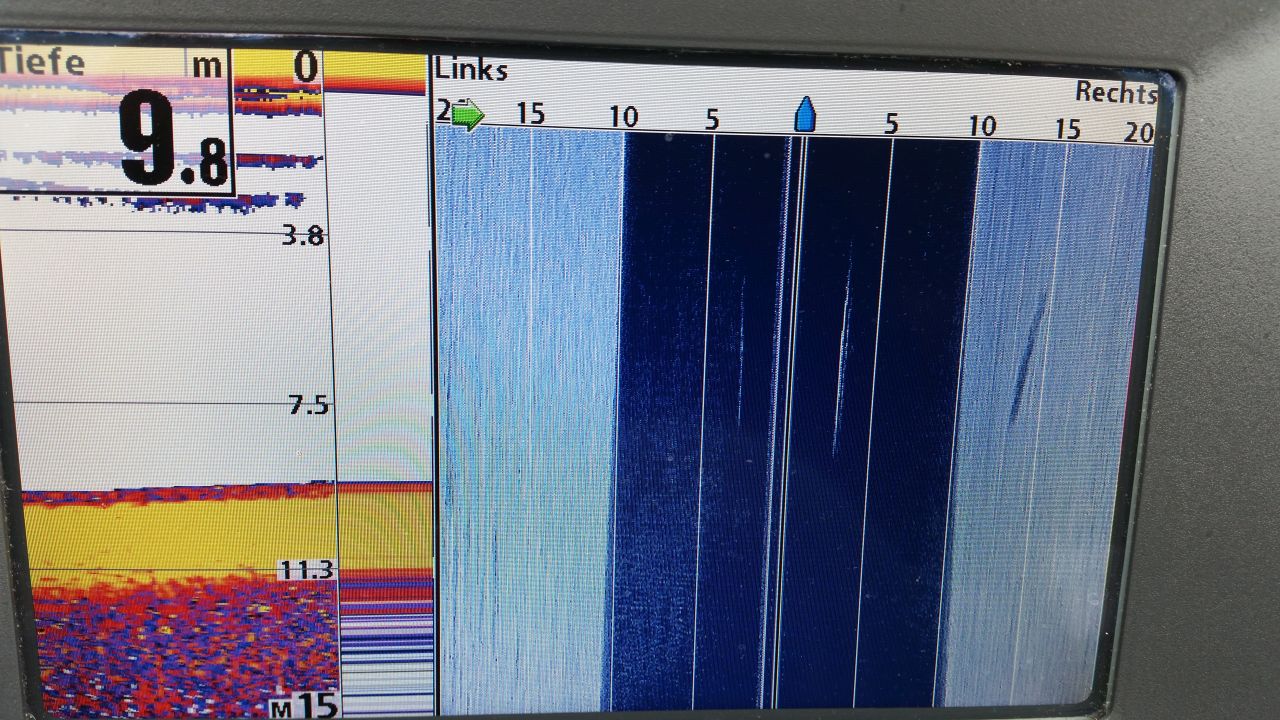 Hier ein schönes Bild eines vermutlichen Wels. Anhand des dicken Strich und Schatten am Grund, vermute ich ganz klar, das es ein Wels war. Auch beim ablassen des Gummifisches, blieb er nach 3,0m stehen, obwohl über 9,0m tief war. Vermutlich habe ich den Gummifisch bei ihm auf dem Kopf gesetzt. Ich habe ihn 50-70m verfolgt. Das ganze dauerte ca. 20min. Am 2D Echo erkennt man 2 Striche. Der obere ist mein Gummifisch, der andere darunter der Wels. Man erkennt den Wels schlecht, weil er bei 3,0m  nur schlecht im Sendekegel ist. Am Side Imaging erkennt man, das er mehr rechts vom Boot steht.