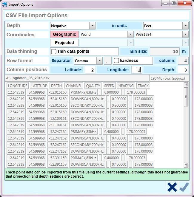Lowrance Sonar Viewer 2.1.2 kann sich auch mit dem Daten aus Logs extrahieren (CSV- und TXT-Format),