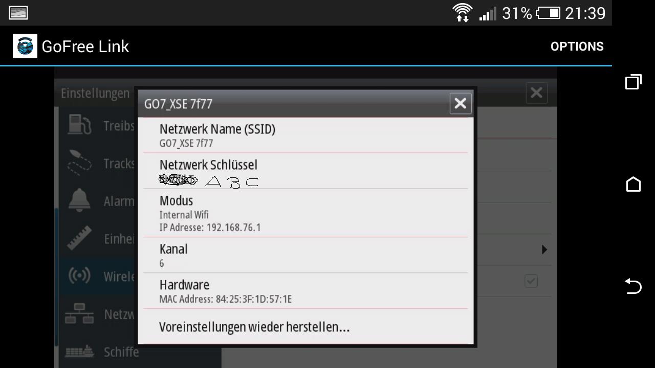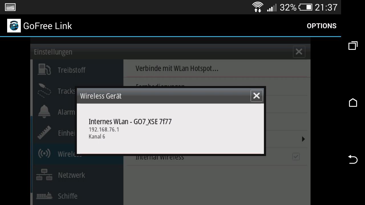 Simrad, internes WLAN als Access-Point geschaltet, Go-Free-Link App auf dem Smartphone oder Tablet installiert, jetzt verbinden...