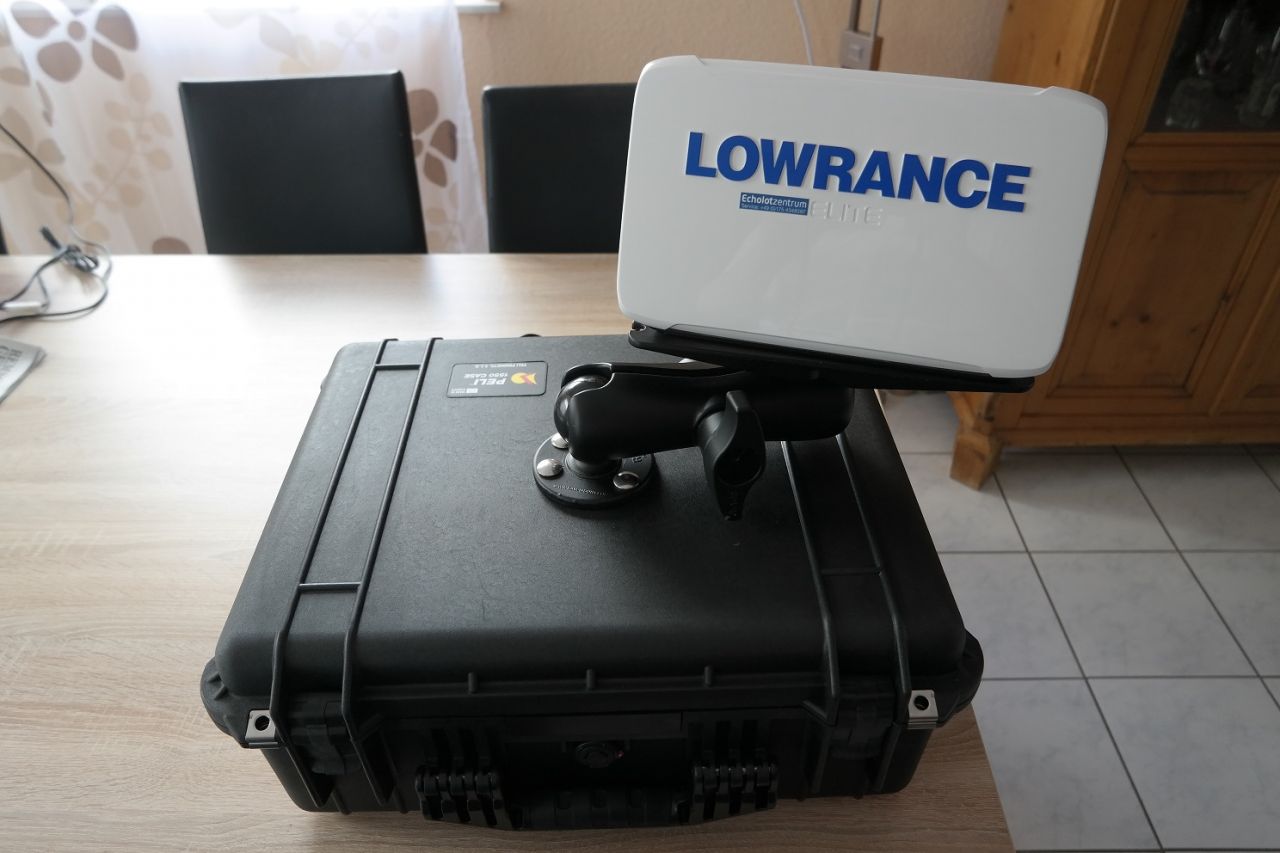 Echolot Lowarance Elite 9 Ti mit Totalscangeber, Edlestahlgeberstange und Geberkonsole von SKRUBBES, Peli Koffer 1550, komplettes Servicepaket von Schlageter und C-Map Karte Deutschland nur Binnengewässer 1432,01€