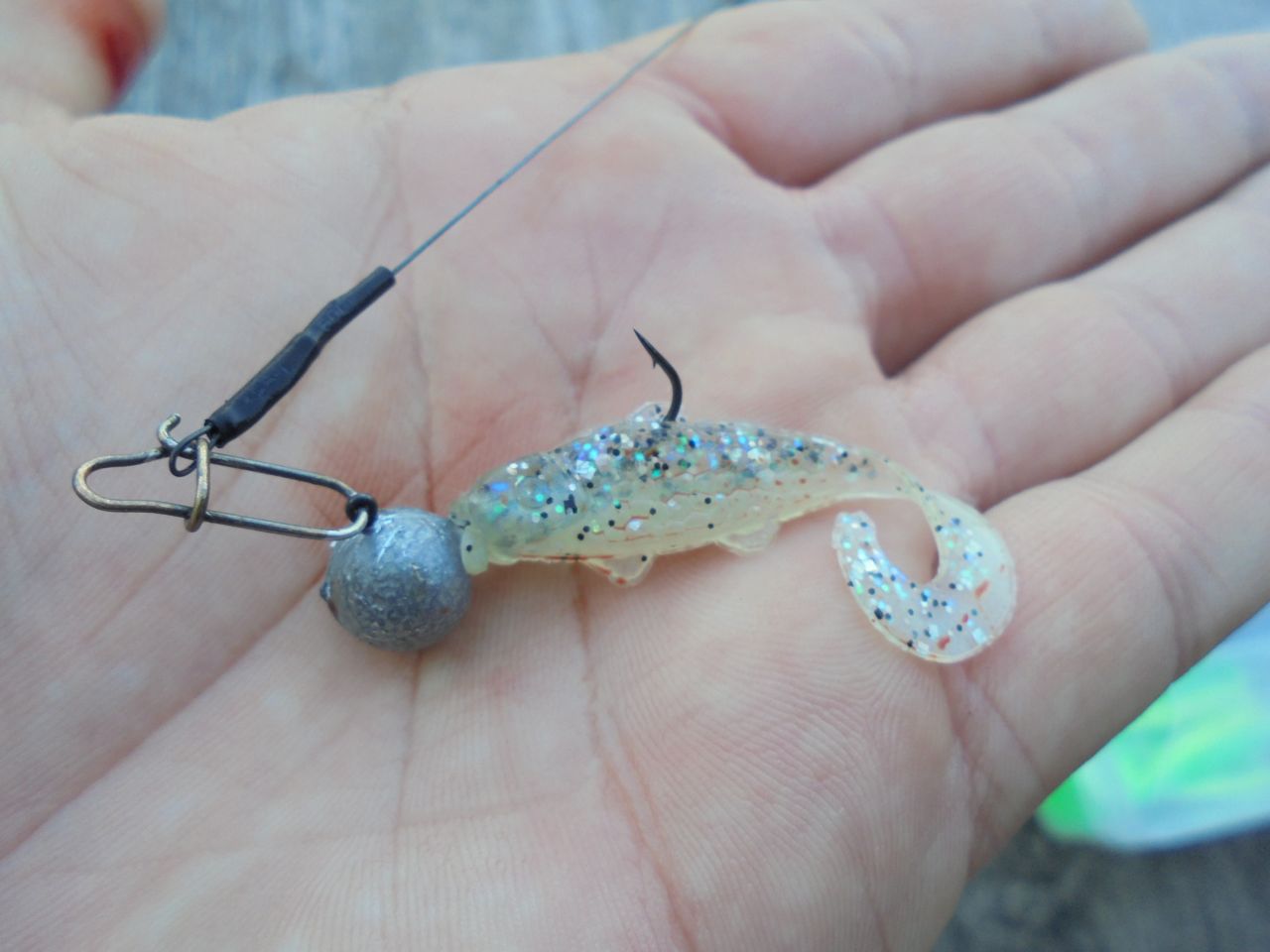 Als zog ich einen kleinen Gummifisch auf. 5 gramm Kopf und 3 cm Gufi.