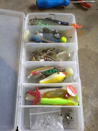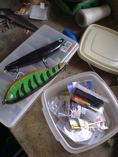 der ganze kleinkram wie offsethaken und snaps usw + meine 2 selbstbau baits die natürlich auch getestet werden