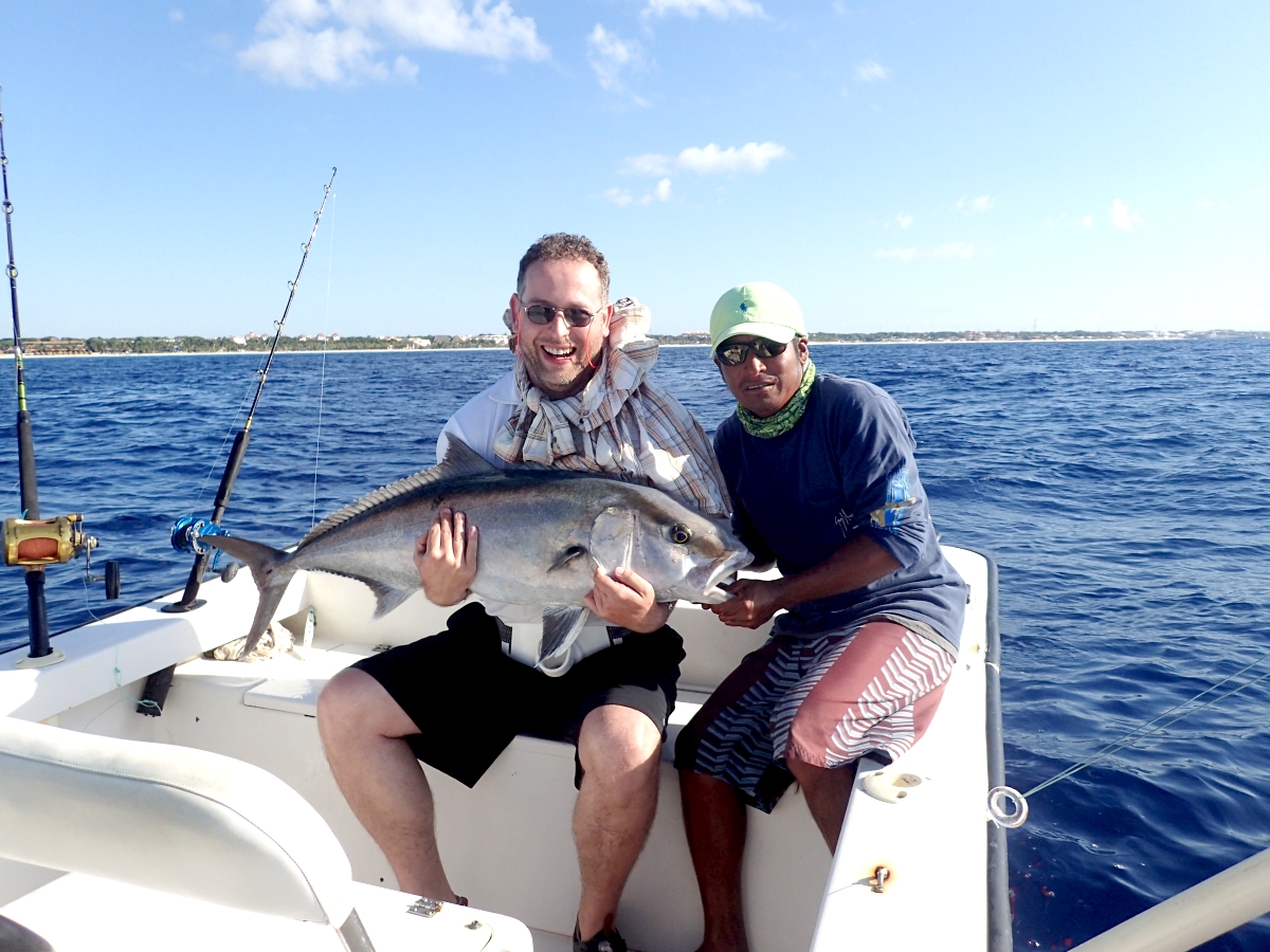 seinen ersten Amberjack in die Kamera halten.