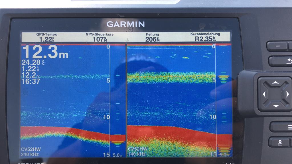 Die obere Schicht ist die Sprungschicht mit pflanzlichem Plankton, die untere Schicht ist vermutlich tierisches Plankton die auf der Flucht vor dem Licht tiefer gegangen sind. Dieses Gewässer muss nährstoffarm sein da auch unterhalb der Sprungschicht Fische und somit Sauerstoff ist.