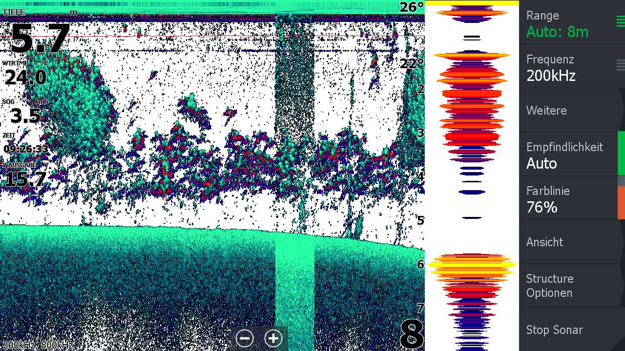 • My/Mein Echo Equipment: Simrad GO7 XSE mit TotalScan-Geber und Navionics+ Karte, Lowrance Mark5X Pro mit 83-200-Geber, ein 500g-Senklot mit 100 Meter Maurerschnur