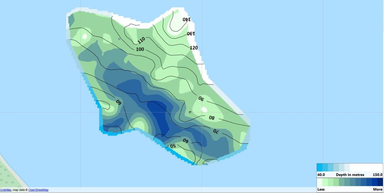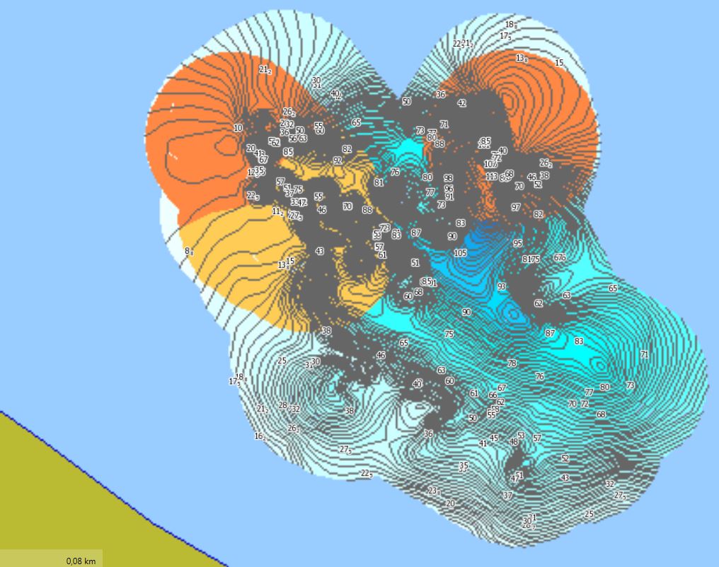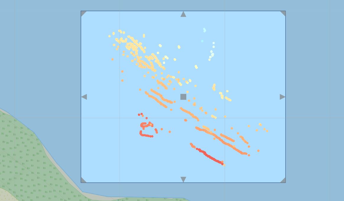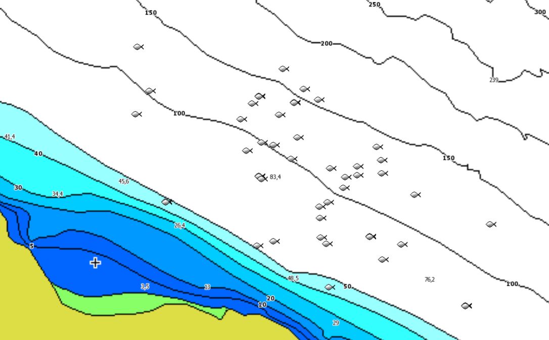 - Noch gravierender: In meinen Logs sind die vielen Nutzern bekannte Aussetzer enthalten (die Logdaten zeigen an diesen Stellen < 1 m Tiefe an, obwohl es weit tiefer war) oder es sind Daten mit extrem dicken Fischschwärmen enthalten, die als 2 ... > 30 m Tiefe interpretiert werden, obwohl an diesen Stellen nachweislich > 80 .... > 120 m Wassertiefe herrschten. Das Ergebnis ist eine Karte von C-Map die hinten und vorne nicht stimmt. Das Gleiche würde auch bei RM eintreten, könnte man in diesem Programm nicht solche Fehler mit einem Klick ausmerzen. Und genau das mache ich dann in RM und im Ergebnis erhalte ich eine realistische Karte (verglichen mit kommerziellen Seekarten dieses Gebietes) die nahezu deckende Bodenhärte-Werte aufweist.
