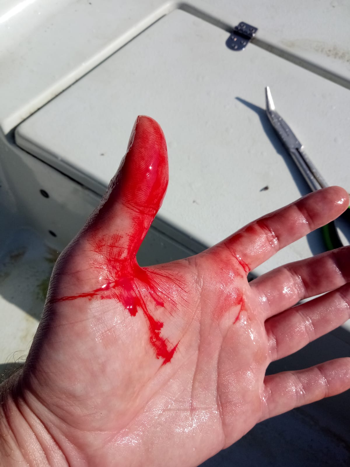 mir ziemlich die ganzen Frontzähne und den Haken in den Daumen gezimmert.