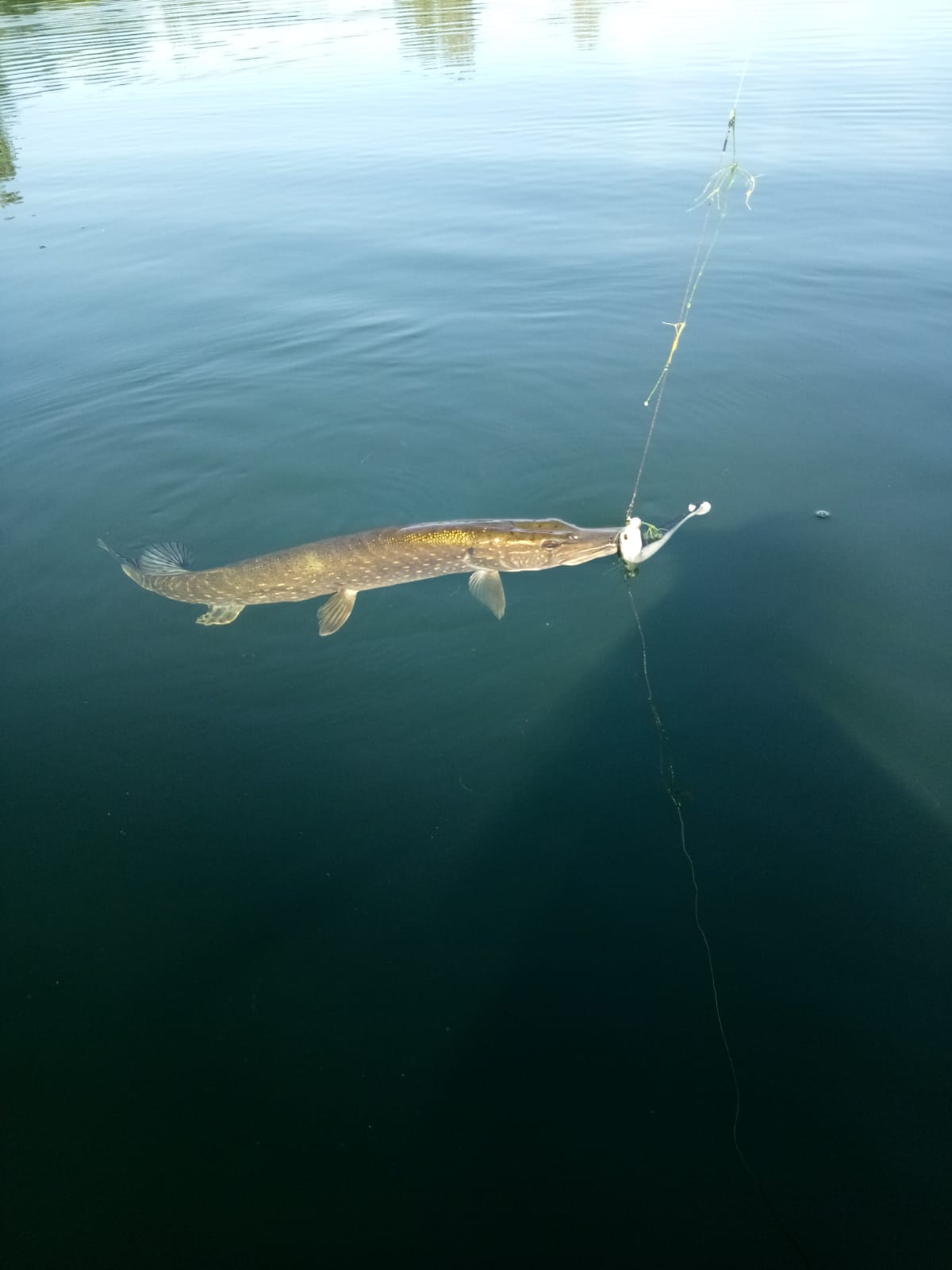Vor lauter Schreck ist der Hecht mit Kescher ins Wasser gefallen.