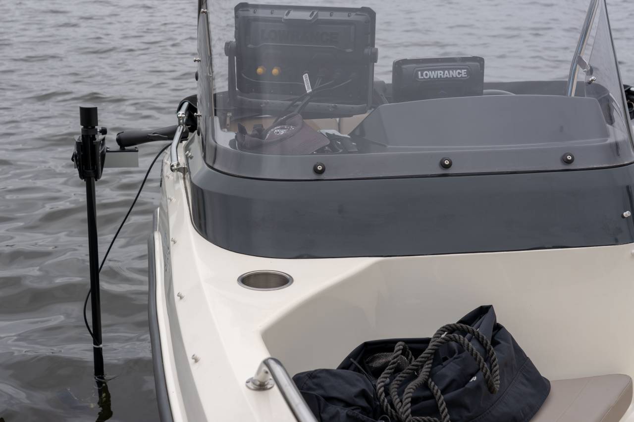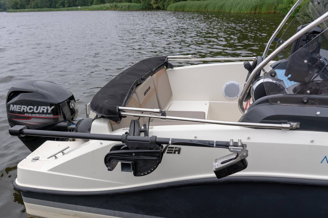 Den Geber habe ich auch wie fiskeguide  flexibel an der Steuerbordseite befestigt. So kann ich ihn schnell hochklappen, oder im Forward-Modus drehen. Die Schrauben für den Geber habe ich so angezogen und gekontert, dass ich ihn mit einem Handgriff zwischen Forward und Down verstellen kann. Zum Einsatz kam eine Minnkota Geberstange. Zum Befestigen habe ich eine RAM-Mount Halterung genommen.