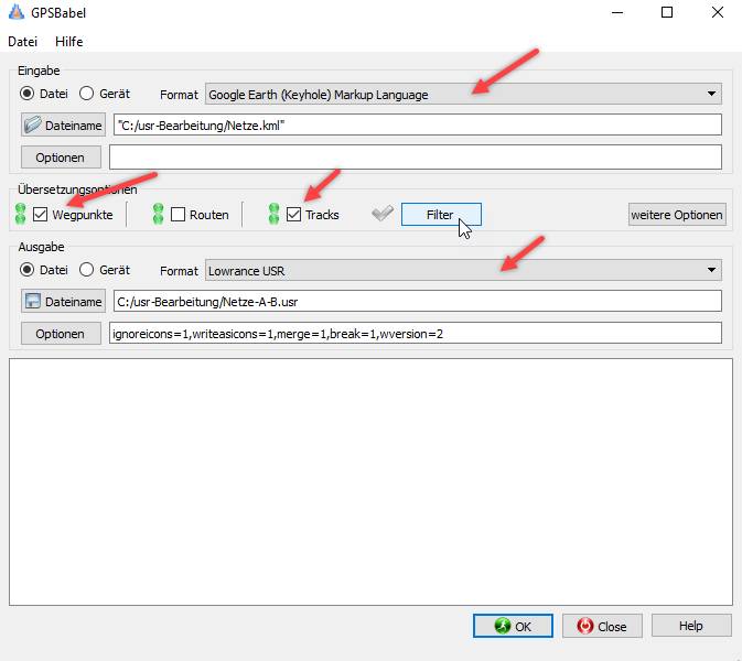 Mit GPSBabel 1.5.3 konvertieren wir nun die Datei Netze.kml nach Netze-A-B.usr