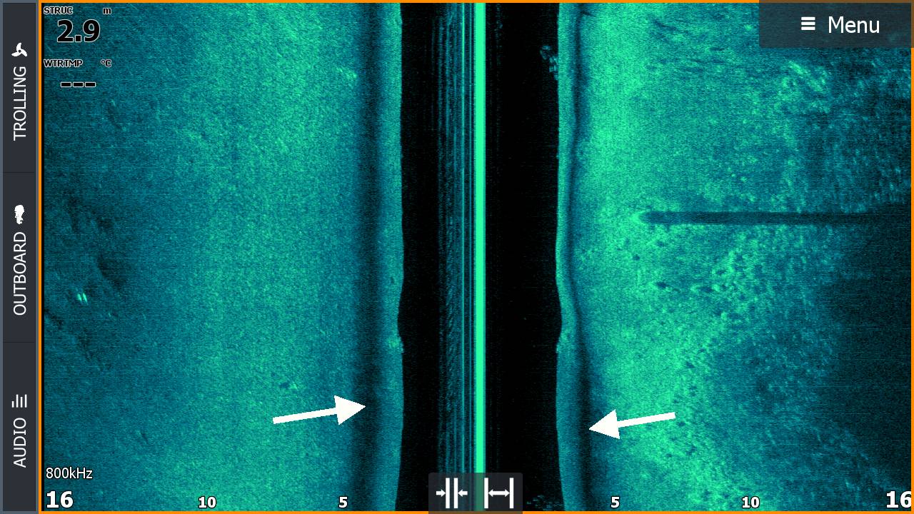 Ich habe auf dem Plot von meinem Structurescan (2-in-1 Geber am HDS Carbon 9) einen permanenten Schatten in dem Bereich, wo der Grund beginnt. Also: In der Mitte vom Bildschirm (Oberfläche) geht es links und rechts runter, dann wird der Grund hell angezeigt (klar!) und dann kommt ein dunkler Bereich, danach wieder hell mit der gewohnten Struktur. Sowohl an Backbord und Steuerbord. Der Effekt ist besonders stark bei 800kHz, da ist es fast Schwarz, bei 455kHz ist er nur leicht wahrzunehmen.