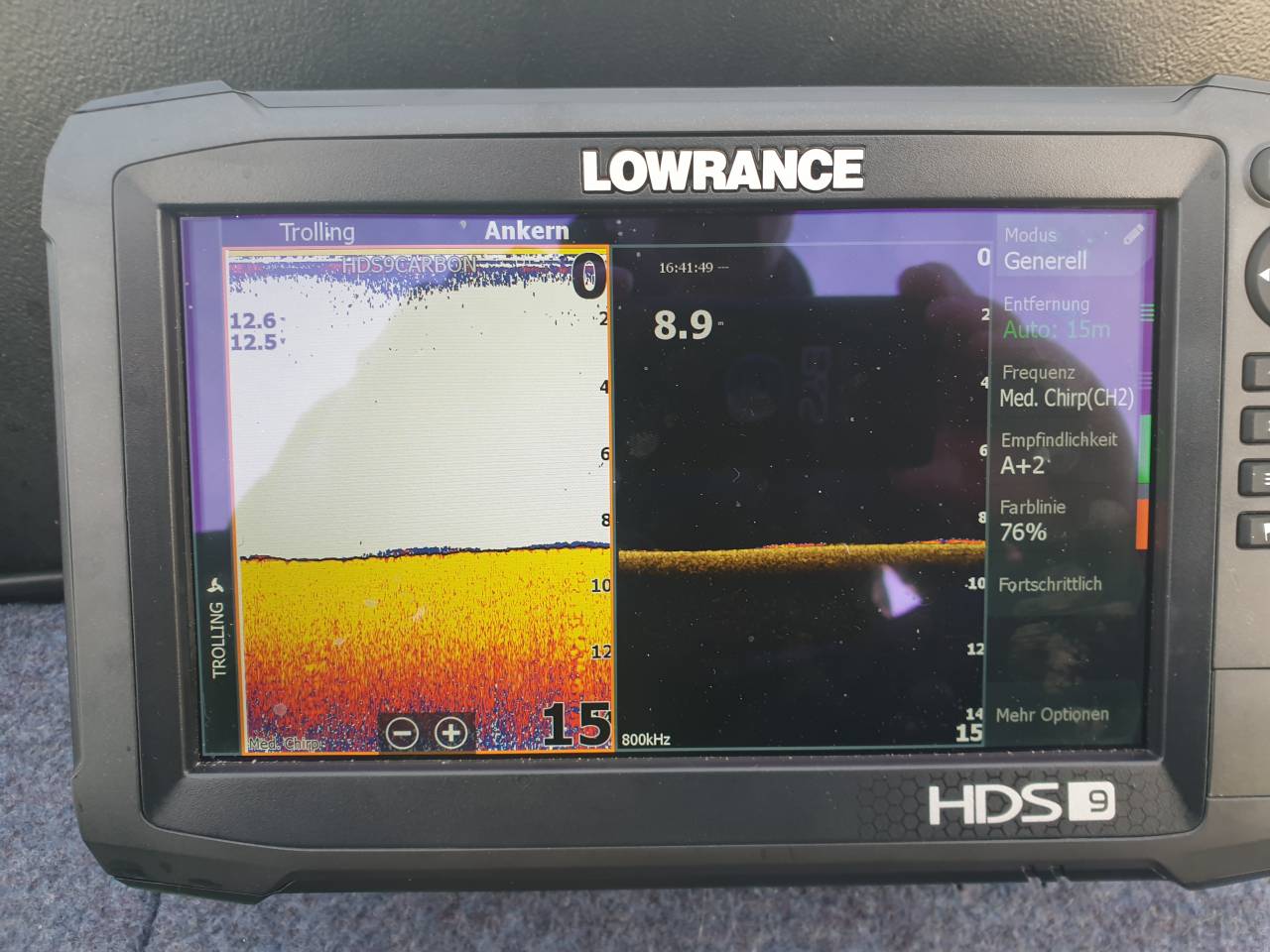 • My/Mein Echo Equipment: Simrad GO7 XSE mit TotalScan-Geber und Navionics+ Karte, Lowrance Mark5X Pro mit 83-200-Geber, ein 500g-Senklot mit 100 Meter Maurerschnur