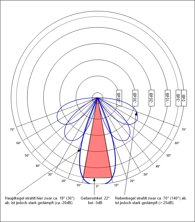 Die abgebildeten Nebenkeulen können je nach Geber und dessen Charakteristik in unterschiedlicher Form und Abstrahlrichtung vorhanden sein.