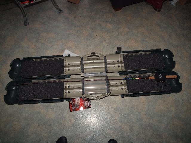 Habe ihn dann einfach mal geordert und ne Woche später liegt das Schmuckstück auch schon bei mir auf dem Tisch. Auf den ersten Blick macht er nen guten Eindruck. Also aufgemacht und schon überrascht. Hatte ich im Laden einen gesehn der durch 2 kleine schnallen zu gemacht wurde hat dieser hier schon 4 auf der Längsseite, 1 am Griff, die auch beim Tragen nicht stört sowie je 1 auf den Stirnseiten. Das Innenleben sieht auch solide aus. Der Platz reicht für 4 Ruten. Und angeblich gibt’s keine Koffer in die montierte Baitcaster passen. Aber sie tun es. Ja sie gehen einfach zu und werden nicht gequetscht. Die größenverstellung geht über etwa 8 Stufen die nicht gleichmäßig ausgeführt werden müssen. Man kann auch nur eine Seite länger machen. Sie funktioniert über 8 Verschraubungen pro Seite und sind mit Metallgewinden versehen. Also keine billigen Kunsstoffgewinde die nicht halten. Vorder- und Hinterteil sind mit Akkustikschaumstoff gepolstert der auch die Verschraubungen verdeckt damit da nichts verkratzen kann. Die Durchführungen sind auch mit Schaumstoff ausgepolstert damit der Blank nicht scheuern tut.